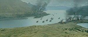 In Peter Jackson's film The Two Towers, the Haradrim appear Middle Eastern, with turbans, flowing robes, and riding elephants. A companion book on the film's "Creatures" states that the Haradrim were based on 12th century Saracens.[29] The battle scene in Ithilien between the rangers of Gondor and the men of Harad was shot at the Twelve Mile Delta near Queenstown, New Zealand.[30]
