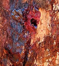 Occasionally a bloodwood tree will shed a piece of bark, hence opening a "wound" through which a blood-like kino will flow. The sap flows until it crystallises, covering up the hole in the bark. Australian Aboriginals collect this substance as bush medicine. They apply the sticky gum directly to sores or cuts and it works as an antiseptic. If the sap is in a dried form, it can be crushed into powder and boiled in water to use as an antiseptic wash.[13]