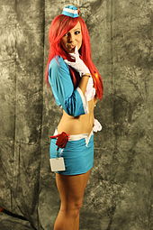 Most cosplayers create their own outfits, referencing images of the characters in the process. In the creation of the outfits, much time is given to detail and qualities, thus the skill of a cosplayer may be measured by how difficult the details of the outfit are and how well they have been replicated. Because of the difficulty of replicating some details and materials, cosplayers often educate themselves in crafting specialties such as textiles, sculpture, face paint, fiberglass, fashion design, woodworking and other uses of materials in the effort to render the look and texture of a costume accurately.[3] Almost all cosplayers wear wigs in conjunction with their outfit in order to further improve the resemblance to the character. This is especially necessary for anime and manga characters who often have unnaturally coloured and uniquely styled hair. Simpler outfits may be compensated for their lack of complexity by paying attention to material choice, and overall excellent quality. The process of creation may then be very long and time-consuming, making it a very personal journey and achievement for many. This taxing and often expensive process is known to unite cosplayers and is considered a part of the culture of cosplay.
