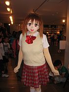 Animegao (アニメ顔, anime face) is a type of kigurumi used to portray anime or cartoon characters. The face of the performer is fully covered with a stylized mask, and the costume of the character is worn. Animegao costumes are used both in professional stage shows and by cosplayers, sometimes called "dollers", who make custom masks of various characters. It is still a very minor part of the cosplay scene in Japan, though around 2005, it began attracting attention in other countries, including the United States, Canada, and European countries.