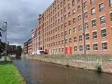 Water continued to be used to drive rural mills but mills, driven by steam, were built in towns alongside streams or canals to provide water for the engine. Murrays' Mills alongside the Rochdale Canal, in Ancoats were powered by 40 hp Boulton and Watt beam engines.[54] Some were built as room and power mills, which let space to entrepreneurs. The mills, often 'L' or U-shaped, were narrow and multi-storeyed. The engine house, warehousing and the office were inside the mill, although stair towers were external. Windows were square and smaller than in later mills. The walls were of unadorned rough brick. Construction was sometimes to fireproof designs. The mills are distinguished from warehouses in that warehouses had taking-in doors on each storey with an external hoist beam.[55] Only the larger mills have survived.