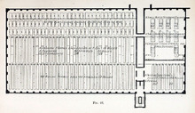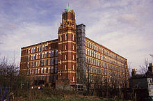 Engines were run at higher pressures and from 1875, powered horizontal shafts on each floor by means of ropes. This was a prominent change as a rope race had to be built running the height of the mill. The engine needed more space and the engine house, boiler house and economiser were external to the main mill.[76] Mills continued to get bigger, and were sometimes paired; two mills being driven by one engine. Another change was the trend of having carding on one floor. To achieve this, the ground floor was extended outwards behind the mill often a full mill width.[77] In a single mill, the crosswall divided the blowing room from the rest, as it was here that there was greatest risk of fire.