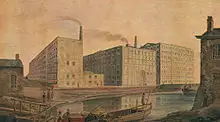 Richard Arkwright obtained a patent for his water frame spinning machinery in 1769.[28] Although its technology was similar to that of Lewis Paul, John Wyatt, James Hargreaves and Thomas Highs, Arkwright's powers of organisation, business acumen and ambition established the cotton mill as a successful business model and revolutionary example of the factory system.[29][28][30] Arkwright's first mill – powered by horses in Nottingham in 1768 – was similar to Paul and Wyatt's first Birmingham mill although by 1772 it had expanded to four storeys and employed 300 workers.[29][28] In 1771, while the Nottingham mill was at an experimental stage, Arkwright and his partners started work on Cromford Mill in Derbyshire, which "was to prove a major turning point in the history of the factory system".[31] It resembled the Paul-Wyatt water-powered mill at Northampton in many respects,[32] but was built on a different scale, influenced by John Lombe's Old Silk Mill in Derby[33] and Matthew Boulton's Soho Manufactory in Birmingham.[34] Constructed as a five-storey masonry box; high, long and narrow, with ranges of windows along each side and large relatively unbroken internal spaces, it provided the basic architectural prototype that was followed by cotton mills and English industrial architecture through to the end of the 19th century.[35]
