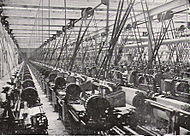 A cotton mill is a building housing spinning or weaving machinery for the production of yarn or cloth from cotton,[1] an important product during the Industrial Revolution in the development of the factory system.[2]