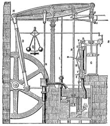 In 1781 James Watt registered a patent for the first rotative steam engine designed to "give motion to the wheels of mills or other machines".[49] Concerns remained over the smoothness of the power supplied by a steam engine to cotton mills, where the regularity of the yarn produced was dependent on the regularity of the power supply,[50] and it was not until 1785 at Papplewick, in Robinson's Mill near Nottingham that a steam engine was successfully used to drive a cotton mill directly.[51] Boulton and Watt's engines enabled mills to be built in urban contexts and transformed the economy of Manchester, whose importance had previously been as a centre of pre-industrial spinning and weaving[52] based on the domestic system.[4] Manchester had no cotton mills until the opening of Arkwright's Shudehill Mill in 1783 and in 1789 Peter Drinkwater opened the Piccadilly Mill – the town's first mill to be directly powered by steam – and by 1800 Manchester had 42 mills, having eclipsed all rival textile centres to become the heart of the cotton manufacturing trade.[53]