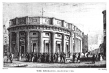 The commercial centre of Cottonopolis was the exchange's trading hall. The first of Manchester's exchanges was built in the market place by Sir Oswald Mosley in 1727 for chapmen to transact business.[12] It was subsequently re-built three times. Thomas Harrison built an exchange in the Greek Revival style between 1806 and 1809[13] After it opened, membership was required and trading was not restricted to textiles. Its early members were the owners of mills and warehouses, but later business was conducted by their agents and managers. Harrison's exchange was enlarged between 1847 and 1849 by Alex Mills. After a visit in 1851, Queen Victoria granted the exchange the title the Manchester Royal Exchange. The third exchange, designed by Mills and Murgatroyd, opened in 1874.[14] It was built in the Classical style with Corinthian columns and a dome.[15] The Royal Exchange was lavishly re-built by architects Bradshaw Gass & Hope in 1914–21 and at the time had the largest trading room in the world. Its vast hall was 29.2 metres high and had an area of 3683 square metres. The exchange had a membership of up to 11,000 cotton merchants who met every Tuesday and Friday to trade their wares beneath the 38.5-metre high central glass dome. It was badly damaged in World War II and ceased operation for cotton trading in 1968.