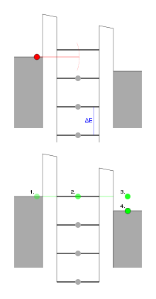 When a positive voltage is applied to the gate electrode the energy levels of the island electrode are lowered. The electron (green 1.) can tunnel onto the island (2.), occupying a previously vacant energy level. From there it can tunnel onto the drain electrode (3.) where it inelastically scatters and reaches the drain electrode Fermi level (4.).