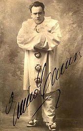 The modern archetype of the evil clown has unclear origins; the stock character appeared infrequently during the 19th century, in such works as Edgar Allan Poe's "Hop-Frog",[1] which is believed by Jack Morgan, of the University of Missouri-Rolla, to draw upon an earlier incident "at a masquerade ball", in the 14th century, during which "the King and his frivolous party, costumed—in highly flammable materials—as simian creatures, were ignited by a flambeau and incinerated, the King narrowly escaping in the actual case."[2] Evil clowns also occupied a small niche in drama, appearing in the 1874 work La femme de Tabarin by Catulle Mendès and in Ruggero Leoncavallo's Pagliacci (accused of being a plagiarism of Mendès' piece), both works featuring murderous clowns as central characters.[3][4]