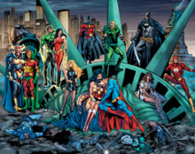 A teaser poster was released, which shows Wonder Woman comforting Superman, Batman in a different costume (with a sword and what appears to be chain mail armor) and Donna Troy wearing her Wonder Girl costume again. Kyle Rayner is wearing a yellow ring, and Mary Marvel is shown partially in shadow. Mister Miracle stands next to Big Barda. Also notable among the poster is a Legion flight ring, a minuscule red hand (the Atom's) sticking out of the rubble, and the bodies of Blue Beetle (Ted Kord), Maxwell Lord, The Question (Vic Sage), and Jade — major or notable heroes who had recently died. The heroes are gathered around the head of the Statue of Liberty; the headless body of the statue can be seen in the background.