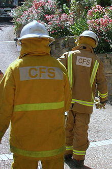 Fire fighters wear yellow protective clothing, with a two-piece set being the standard (Bunker pants, and turn out coat). With the introduction of PBI Gold (improved structural fire-fighting clothing), all CFS volunteers who have completed BA training are now seen wearing yellow/brown coloured clothing. All turn out coats have "CFS" or "FIRE" on the back in reflective writing. More modern jackets also have day/night striping around the sleeves and bottom of the jacket. Safety Vests are provided for work on the roads. these have "Fire", "Rescue", or "CFS" on both front and back in reflective writing.[1]