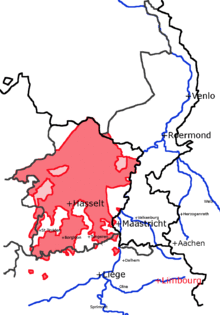 From its beginnings, Loon was associated with the Prince-bishop of Liège and by 1190 the count had come under the bishop's overlordship.[1] In the fourteenth century, the second time the male line ended, the prince-bishops themselves took over the county directly. Loon approximately represented the Dutch-speaking (archaic French: thiois) part of the princedom. All of the Dutch-speaking towns in the Prince-Bishopric, with the status of being so-called "Good Cities" (French: bonnes villes), were in Loon, and are in Belgian Limburg today.[2] These were Beringen, Bilzen, Borgloon, Bree, Hamont, Hasselt, Herk-de-Stad, Maaseik, Peer and Stokkem.