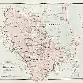 Stanley was formerly a county in New South Wales between the establishment of Brisbane in 1826, and the formation of Queensland as a separate colony in 1859, and was officially established by proclamation on 27 February 1843. It was generally understood (though only somewhat formally defined) to include the land between the 27th and 28th parallels of latitude, Moreton Bay and the western ranges, covering an area of 1,724 square miles (4,470 km2).[2] In 1852 it had a population of 2,000. Wheat, coffee, cotton and tobacco were described as being important crops. By 1863, the county had contracted to its present boundaries.