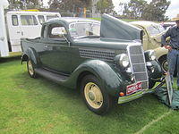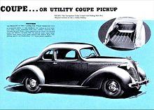 The body style originated in Australia.[6] It was the result of a 1932 letter from the wife of a farmer in Victoria, Australia, to Ford Australia asking for "a vehicle to go to church in on a Sunday and which can carry our pigs to market on Mondays". In response, Ford designer Lew Bandt developed a vehicle to meet the client's request. Commencing in October 1933 with assistance from draftsman A. Scott,[7] Bandt used the passenger compartment and roof from the Ford V8 5 window coupe and extended the rear section using a single fixed side panel on each side, with a hinged tailgate at the rear to create the load carrying compartment. The model was released in July 1934 as the coupe utility.[7] In his book "Early Australian Automotive Design: The First Fifty Years", Australian motoring historian Norm Darwin suggests the idea was not a big leap in design from the existing roadster utility that had been produced by various manufacturers as early as 1924.[8] Darwin also suggests that the idea was being developed by other manufacturers simultaneously, as General Motors-Holden's Ltd released Bedford and Chevrolet coupe utilities in September 1934[9] only two months after Ford, with the main difference being the use of the three window coupe roof on the GM-H products. Other manufacturers were quick to follow with coupe utilities based on various passenger and light truck chassis.[10]