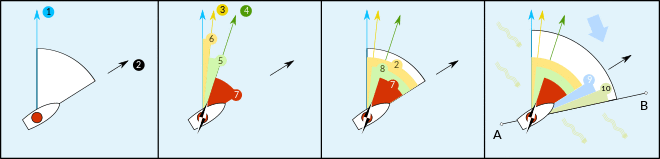 The path that a vessel follows over the ground is called a ground track, course made good or course over the ground.[1] For an aircraft it is simply its track.[3] The intended track is a route. For ships and aircraft, routes are typically straight-line segments between waypoints. A navigator determines the bearing (the compass direction from the craft's current position) of the next waypoint. Because water currents or wind can cause a craft to drift off course, a navigator sets a course to steer that compensates for drift. The helmsman or pilot points the craft on a heading that corresponds to the course to steer. If the predicted drift is correct, then the craft's track will correspond to the planned course to the next waypoint.[1][3] Course directions are specified in degrees from north, either true or magnetic. In aviation, north is usually expressed as 360°.[4] Navigators used ordinal directions, instead of compass degrees, e.g. "northeast" instead of 45° until the mid-20th century when the use of degrees became prevalent.[5]