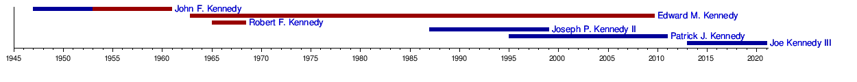 In November 2012, Joseph P. Kennedy III, son of former Rep. Joseph P. Kennedy II and grandson of the late Sen. Robert F. Kennedy, was elected to the U.S. House of Representatives from Massachusetts's 4th congressional district. In 2020, he lost the 2020 Senate primary election in Massachusetts to Ed Markey, the first Kennedy to ever lose an election in the state.[7][8]