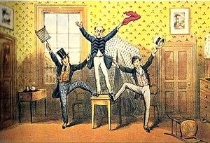 Burnand adapted the libretto for this "triumviretta" from John Maddison Morton's famous farce, Box and Cox, which had premiered in London in 1847, starring J. B. Buckstone.[5] The text follows Morton's play closely, differing in only two notable respects. First, in the play the protagonists lodge with Mrs Bouncer; in Burnand's version the character is Sergeant Bouncer.[n 1] This change was necessitated by the intention of performing the piece for the all-male gathering of the Moray Minstrels. Secondly, Burnand wrote original lyrics to be set to music by the 24-year-old Sullivan. The date and venue of the first performance was much disputed, starting in 1890, in duelling letters to The World, with Burnand and Lewis each claiming to have hosted it. Andrew Lamb has concluded that the run-through at Burnand's home on 23 May 1866 was a rehearsal, followed by the first performance at Lewis's home on 26 May 1866.[8] [n 2] A printed programme for the 23 May performance later surfaced, suggesting more than a mere rehearsal,[10] but the composer himself supported the later date, writing to The World, "I feel bound to say that Burnand's version came upon me with the freshness of a novel. My own recollection of the business is perfectly distinct".[11] George Grove noted in his diary of 13 May that he attended a performance of Cox and Box, which Lamb takes to have been an open rehearsal; however, Foster calls the performance at Burnand's house a rehearsal.[12] The original cast was George du Maurier as Box, Harold Power as Cox, and John Foster as Bouncer,[n 3] with Sullivan himself improvising the accompaniment at the piano.[8]