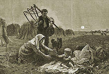 As the cultivation of grain developed, the seasonal harvest became a major agricultural event. Grain could be pulled or, later, cut with a sickle and tied into sheaves to be threshed. The scythe improved on the sickle by giving the mower a more ergonomic stance and permitting a larger blade. However, keeping the grain stems aligned in the windrow required great skill and where these skills were less available the addition of a cradle helped to manage the grain heads, reducing the sheaver's work-load and improving efficiency at threshing. Lesser skilled mowers could harvest significantly more grain by using the cradle.[1] Although the grain cradle was in previous use in parts of Europe it was not generally used because skilled labour was traditionally available. Between 1800 and 1840 the cradle was widely adopted in the expanding grain growing area of Midwestern United States, undergoing some refinement there and resulting in the American-pattern cradle. Fifty American patents were issued between 1823 and 1930, the first in 1823 in western New York state and the last in 1924 in West Virginia peaking between 1875 and 1900.[2][3] Hay does not require aligning and the scythe is more efficient without a cradle, so it was removed for haymaking.