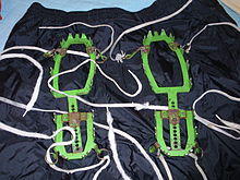 A crampon is a traction device that is attached to footwear to improve mobility on snow and ice during ice climbing.[1] Besides ice climbing, crampons are also used for secure travel on snow and ice, such as crossing glaciers, snowfields and icefields, ascending snow slopes, and scaling ice-covered rock. There are three main attachment systems for footwear: step-in, hybrid, and strap bindings. The first two require boots with welts, as a tension lever attaches the crampon to the heel. The last type (strap bindings) are more versatile and can adapt to virtually any boot or shoe, but often do not fit as precisely as the other two types.[2]