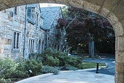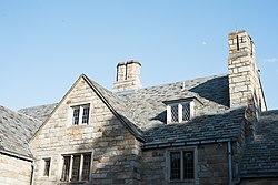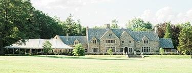 The property had been the estate of Edward B. Gallaher, owner (since 1917) of the Clover Manufacturing Company[3] on Main Avenue, which made industrial abrasives such as sandpaper.[2] He began buying the land, which was previously farmland owned by different families, in the 1919s.)<Norwalk land record, vol. 163 p. 468=bot/>) After Gallaher's death, the property was left to his alma mater, Stevens Institute of Technology in Hoboken, New Jersey, which continued to own it while Gallaher's wife lived there. After she died, the institute sold it to the city in 1965.[2] The Gallaher mansion, still on the property, is a 20-room, Tudor Revival-style English fieldstone manor house built in 1930 or 1931 (ref May 5, 2010 Connecticut State Register of Historic Places, Hartford 468=bot/>). The mansion, which is now used for community meetings and weddings, has oak paneling, French doors and stained glass windows.[3]