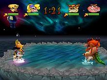 Crash Bash is a party video game featuring eight playable characters with differing powers and skills.[1][2] The game's storyline involves a contest of good vs. evil held between the twin witch doctor spirits Aku Aku and Uka Uka.[3] The gameplay consists of 28 different mini-games and three distinct modes of play: "Adventure", "Battle" and "Tournament".[4] Crash Bash includes multiplayer compatibility for up to four human players with the use of the PlayStation Multitap.[5]