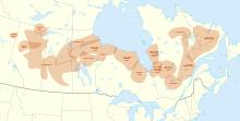 Cree is believed to have begun as a dialect of the Proto-Algonquian language spoken between 2,500 and 3,000 years ago in the original Algonquian homeland, an undetermined area thought to be near the Great Lakes. The speakers of the proto-Cree language are thought to have moved north, and diverged rather quickly into two different groups on each side of James Bay. The eastern group then began to diverge into separate dialects, whereas the western grouping probably broke into distinct dialects much later.[8] After this point it is very difficult to make definite statements about how different groups emerged and moved around, because there are no written works in the languages to compare, and descriptions by Europeans are not systematic; as well, Algonquian people have a tradition of bilingualism and even of outright adopting a new language from neighbours.[9]