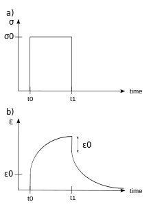 At a time t0, a viscoelastic material is loaded with a constant stress that is maintained for a sufficiently long time period. The material responds to the stress with a strain that increases until the material ultimately fails. When the stress is maintained for a shorter time period, the material undergoes an initial strain until a time t1 at which the stress is relieved, at which time the strain immediately decreases (discontinuity) then continues decreasing gradually to a residual strain.