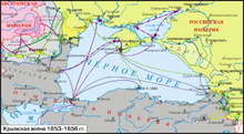 The Crimean War was one of the first wars to be documented extensively in written reports and photographs: notably by William Russell (writing for The Times [of London] newspaper[12]) and the photographs of Roger Fenton.[13] News from war correspondents reached all nations involved in the war and kept the public citizenry of those nations better informed of the day-to-day events of the war than had been the case in any other war to that date. However, nowhere more than Britain was the public kept better informed of the day-to-day realities of the war in the Crimea.[14] Consequently, public opinion played a larger role in this war than in any other war in history.[15] Furthermore, the advent of steamships and the telegraph meant that news from the war zone in the Crimea sped its way to western Europe and London in five days. After the French extended the telegraph from Bucharest to Varna on the coast of the Black Sea during the winter of 1854, the news reached London in two days.[16] Then, when the British laid an underwater cable from Varna across the Black Sea to their supply port on the southern coast of the Crimean peninsula in April 1855, news from the front reached London in a few hours.[16] The relatively instantaneous news created a real "patriotism" among the middle classes of England which brought down the coalition Aberdeen government and brought Lord Palmerston into office as Prime Minister.[17]