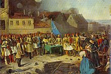 Following the Ottoman ultimatum in September 1853, forces under the Ottoman general Omar Pasha crossed the Danube at Vidin and captured Kalafat in October 1853.[54] Simultaneously, in the east, the Ottomans crossed the Danube at Silistra and attacked the Russians at Oltenitza. The resulting Battle of Oltenitza was the first engagement following the declaration of war.[55] The Russians counterattacked, but were beaten back. On December 31, 1853, the Ottoman forces at Kalafat moved against the Russian force at Chetatea or Cetate, a small village nine miles north of Kalafat[56] and engaged them on January 6, 1854.[57] The battle began when the Russians made a move to recapture Kalafat. Most of the heavy fighting however, took place in and around Chetatea until the Russians were driven out of the village.[58] Despite the setback at Chetatea, on January 28, 1854, Russian forces laid siege to Kalafat. The siege would continue until May 1854 when the Russians lifted the siege. The Ottomans would also later beat the Russians in battle at Caracal.