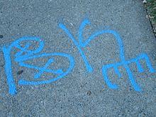 Some practices of Crip gang life include graffiti and substitutions and deletions of particular letters of the alphabet. The letter "b" in the word "blood" is "disrespected" among certain sets and written with a cross inside it because of its association with the enemy. The letters "CK", which stand for "Crip killer", are avoided and replaced by "cc". For example, the words "kick back" are written "kicc bacc". Many other letters are also altered due to symbolic associations.[37] Crips traditionally refer to each other as "Cuzz", which itself is sometimes used as a moniker for Crip. "Crab" is the most disrespectful epithet to call a Crip, and can warrant fatal retaliation.[38] Crips in prison modules in the 1970s and 1980s sometimes spoke Swahili to maintain privacy from guards and rival gangs.[39]