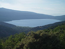 The availability of water varies significantly throughout the region. The area between Rijeka and Vinodol contains numerous freshwater springs that are largely tapped for water supply systems.[25] Water significantly contributed to the geomorphology of the area, especially in the Bay of Bakar, a ria located between Rijeka and Kraljevica.[26] At the seaward slopes of Velebit, in areas near Senj and Karlobag, surface watercourses are sparse. They form losing streams flowing to the sea, while springs of lower yield dry up during summer.[27] The most significant watercourse in the region is the 17.5-kilometre (10.9-mile) long Rječina River,[28] flowing into the Adriatic Sea in the city of Rijeka.[29] The islands of Cres, Krk, and Lošinj have significant surface water that is used as the primary water supply source on those islands. The most significant among them is Lake Vrana on the island of Cres, containing 220,000,000 cubic metres (7.8×109 cubic feet) of water.[28] The surface of the freshwater lake is at 16 metres (52 feet) above sea level, while its maximum depth is 74 metres (243 feet).[13] The Gulf of Kvarner is an especially significant area for the preservation of biodiversity.[30]
