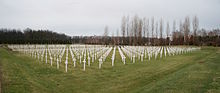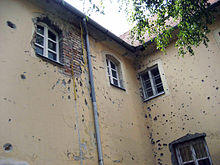 In August 1991, the Battle of Vukovar began.[167][168] Eastern Slavonia was gravely impacted throughout this period, starting with the Dalj massacre,[169] and fronts developed around Osijek and Vinkovci in parallel to the encirclement of Vukovar.[170][171][172][173] In September, Serbian troops completely surrounded the city of Vukovar. Croatian troops, including the 204th Vukovar Brigade, entrenched themselves within the city and held their ground against elite armored and mechanized brigades of the JNA, as well as Serb paramilitary units.[174][175] Vukovar was almost completely devastated; 15,000 houses were destroyed.[176] Some ethnic Croatian civilians had taken shelter inside the city. Other members of the civilian population fled the area en masse. Death toll estimates for Vukovar as a result of the siege range from 1,798 to 5,000.[120] A further 22,000 were exiled from Vukovar immediately after the town was captured.[176][177]