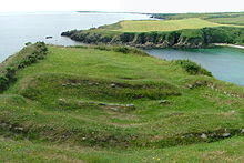 Cronk ny Merriu (English: Hill of the Dead) is one of the remains of promontory forts in the Isle of Man. Close to Port Grenaugh, this site dates back almost 2,000 years. The bank and ditch of Iron Age date created a defensive promontory fort at Cronk ny Merriu. Later, a rectangular building of Norse style and layout stood here, part of a system of coastal lookout posts.