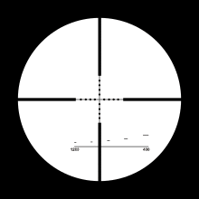 The first suggestion for etched glass reticles was made by Philippe de La Hire in 1700.[4] His method was based on engraving the lines on a glass plate with a diamond point. Many modern crosshairs are actually etched onto a thin plate of glass, which allows a far greater latitude in shapes. Etched glass reticles can have floating elements, which do not cross the reticle; circles and dots are common, and some types of glass reticles have complex sections designed for use in range estimation and bullet drop and drift compensation (see external ballistics). A potential disadvantage of glass reticles is that the surface of the glass reflects some light (about 4% per surface on uncoated glass[5]) lessening transmission through the scope, although this light loss is near zero if the glass is multicoated (coating being the norm for all modern high quality optical products).