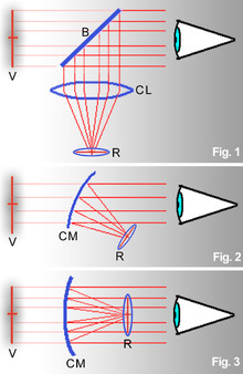 Diagram of three types of reflector sights that produce collimated reticles. The top uses a collimating lens (CL) and a beam splitter (B) to create a virtual image at infinity (V) of a reticle (R). The bottom two use half silvered curved mirrors (CM) as the collimating optics with the reticle off-set or between the mirror and the observer.