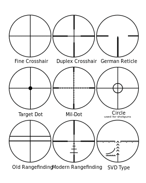 A comparison of different reticles used in telescopic sights. The lower right represents a reticle found in the PSO-1 scope of a Russian SVD designated marksman rifle.