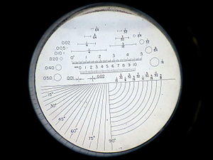 A reticle, or reticule[1][2] (from Latin reticulum 'net'), also known as a graticule (from Latin craticula 'gridiron'), is a pattern of fine lines or markings built into the eyepiece of a sighting device, such as a telescopic sight in a telescope, a microscope, or the screen of an oscilloscope, to provide measurement references during visual examination. Today, engraved lines or embedded fibers may be replaced by a computer-generated image superimposed on a screen or eyepiece. Both terms may be used to describe any set of lines used for optical measurement, but in modern use reticle is most commonly used for gunsights and such, while graticule is more widely used for the oscilloscope display, microscope slides, and similar roles.
