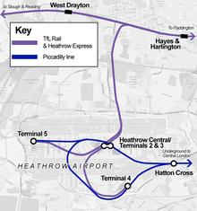 The Heathrow spur has three stations – Heathrow Central (for Terminals 2 and 3), Terminal 4 and Terminal 5[26] – and joins the main route at Airport Junction, between West Drayton and Hayes & Harlington. A flyover near Hayes & Harlington station will allow Heathrow Express trains to pass over the track used by Crossrail, avoiding delays caused by crossings.[32]