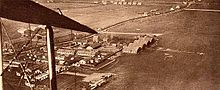 The two aerodromes were combined following the end of the First World War to become Croydon Aerodrome, the gateway for all international flights to and from London. The new aerodrome opened on 29 March 1920 replacing the temporary civil aerodrome at a Cavalry ground on Hounslow Heath.[8] Plough Lane remained a public road crossing the site, and road traffic was halted when necessary, first by a man with a red flag and later by a gate.[9] The aerodrome stimulated a growth in regular scheduled flights carrying passengers, mail and freight, the first destinations being Paris,[8] Amsterdam and Rotterdam. Two flights daily from Paris were scheduled for ease of communication with London during the Paris Peace Conference. In 1923, flights to Berlin Tempelhof Airport began.