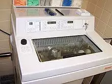 Cryostat are used in medicine to cut histological slides. They are usually used in a process called frozen section histology (see Frozen section procedure). The cryostat is essentially an ultrafine "deli-slicer", called a microtome, placed in a freezer. The cryostat is usually a stationary upright freezer, with an external wheel for rotating the microtome. The temperature can be varied, depending on the tissue being cut usually from minus 20 to minus 30 degree Celsius. The freezer is either powered by electricity, or by a refrigerant like liquid nitrogen. Small portable cryostats are available and can run off generators or vehicle inverters. To minimize unnecessary warming all necessary mechanical movements of the microtome can be achieved by hand via a wheel mounted outside the chamber. Newer microtomes have electric push button advancement of the tissue. The precision of the cutting is in micrometres. Tissue are sectioned as thin as 1 micrometre. Usual histology slides are mounted with a thickness of about 7 micrometres. Specimens that are soft at room temperature are mounted on a cutting medium (often made of egg white) on a metal "chuck", and frozen to cutting temperature (for example at -20 degrees C). Once frozen, the specimen on the chuck is mounted on the microtome. The crank is rotated and the specimen advances toward the cutting blade. Once the specimen is cut to a satisfactory quality, it is mounted on a warm (room temperature) clear glass slide, where it will instantaneously melt and adhere. The glass slide and specimen is dried with a dryer or air dried, and stained. The entire process from mounting to reading the slide takes from 10 to 20 minutes, allowing rapid diagnosis in the operating room, for the surgical excision of cancer. The cryostat can be used to cut histology and tissue slide (e.g., for enzyme localization) outside of medicine, but the quality of the section is poor compared to standard fixed section wax mounted histology. Newer technology such as the Compresstome, a type of vibrating microtome, utilizes agarose tissue embedding instead of an optimal cutting temperature compound to eliminate the need for traditional cryostat freezing and may be used for improved quality sectioning.[2]