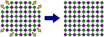 The flat faces (also called facets) of a euhedral crystal are oriented in a specific way relative to the underlying atomic arrangement of the crystal: they are planes of relatively low Miller index.[9] This occurs because some surface orientations are more stable than others (lower surface energy). As a crystal grows, new atoms attach easily to the rougher and less stable parts of the surface, but less easily to the flat, stable surfaces. Therefore, the flat surfaces tend to grow larger and smoother, until the whole crystal surface consists of these plane surfaces. (See diagram on right.)