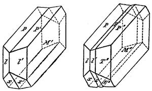 In the triclinic system, the most commonly twinned crystals are the feldspar minerals plagioclase and microcline. These minerals show the Albite and Pericline Laws.[3]