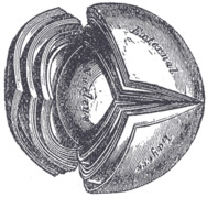 The lens fibers form the bulk of the lens. They are long, thin, transparent cells, firmly packed, with diameters typically 4–7 micrometres and lengths of up to 12 mm long.[3] The lens fibers stretch lengthwise from the posterior to the anterior poles and, when cut horizontally, are arranged in concentric layers rather like the layers of an onion. If cut along the equator, it appears as a honeycomb. The middle of each fiber lies on the equator.[6] These tightly packed layers of lens fibers are referred to as laminae. The lens fibers are linked together via gap junctions and interdigitations of the cells that resemble "ball and socket" forms.