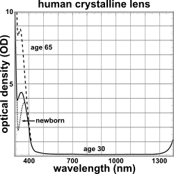 Graph showing optical density (OD) of the human crystalline lens for newborn, 30-year-old, and 65-year-old from wavelengths 300-1400 nm.