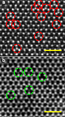 - ^ Hong, J.; Hu, Z.; Probert, M.; Li, K.; Lv, D.; Yang, X.; Gu, L.; Mao, N.; Feng, Q.; Xie, L.; Zhang, J.; Wu, D.; Zhang, Z.; Jin, C.; Ji, W.; Zhang, X.; Yuan, J.; Zhang, Z. (2015). "Exploring atomic defects in molybdenum disulphide monolayers". Nature Communications. 6: 6293. Bibcode:2015NatCo...6.6293H. doi:10.1038/ncomms7293. PMC 4346634. PMID 25695374.