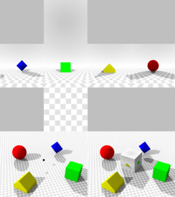 A cube texture indexes six texture maps from 0 to 5 in order Positive X, Negative X, Positive Y, Negative Y, Positive Z, Negative Z.[4][5] The images are stored with the origin at the lower left of the image. The Positive X and Y faces must reverse the Z coordinate and the Negative Z face must negate the X coordinate. If given the face, and texture coordinates , the non-normalized vector can be computed by the function: