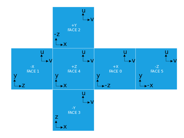 void convert_cube_uv_to_xyz(int index, float u, float v, float *x, float *y, float *z) { // convert range 0 to 1 to -1 to 1 float uc = 2.0f * u - 1.0f; float vc = 2.0f * v - 1.0f; switch (index) { case 0: *x = 1.0f; *y = vc; *z = -uc; break; // POSITIVE X case 1: *x = -1.0f; *y = vc; *z = uc; break; // NEGATIVE X case 2: *x = uc; *y = 1.0f; *z = -vc; break; // POSITIVE Y case 3: *x = uc; *y = -1.0f; *z = vc; break; // NEGATIVE Y case 4: *x = uc; *y = vc; *z = 1.0f; break; // POSITIVE Z case 5: *x = -uc; *y = vc; *z = -1.0f; break; // NEGATIVE Z } } Likewise, a vector can be converted to the face index and texture coordinates with the function: