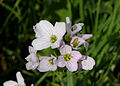 Cardamine pratensis, the cuckoo flower, lady's smock, mayflower, or milkmaids, is a flowering plant in the family Brassicaceae, native throughout most of Europe and Western Asia. The specific name pratensis is Latin for "meadow".