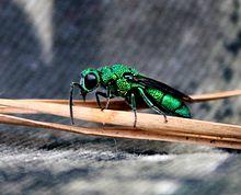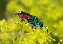 Commonly known as cuckoo wasps or emerald wasps, the hymenopteran family Chrysididae is a very large cosmopolitan group (over 3000 described species) of parasitoid or kleptoparasitic wasps, often highly sculptured,[1] with brilliant metallic colors created by structural coloration.[2] They are most diverse in desert regions of the world, as they are typically associated with solitary bee and wasp species, which are also most diverse in such areas. Their brood parasitic lifestyle has led to the evolution of fascinating adaptations, including chemical mimicry of host odours by some species.[3]