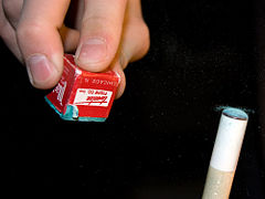 Cue tip chalk (invented in its modern form by straight rail billiard pro William A. Spinks and chemist William Hoskins in 1897)[12][13] is made by crushing silica and the abrasive substance corundum or aloxite[13] (aluminium oxide),[14][15] into a powder.[13] It is combined with dye (originally and most commonly green or blue-green, like traditional billiard cloth, but available today, like the cloth, in many colours) and a binder (glue).[13] Each manufacturer's brand has different qualities, which can significantly affect play. High humidity can also impair the effectiveness of chalk. Harder, drier compounds are generally considered superior by most players.