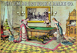 There are few more cheerful sights, when the evenings are long, and the weather dull, than a handsome, well-lighted billiard room, with the smooth, green surface of the billiard table; the ivory balls flying noiselessly here and there, or clicking musically together.[6]